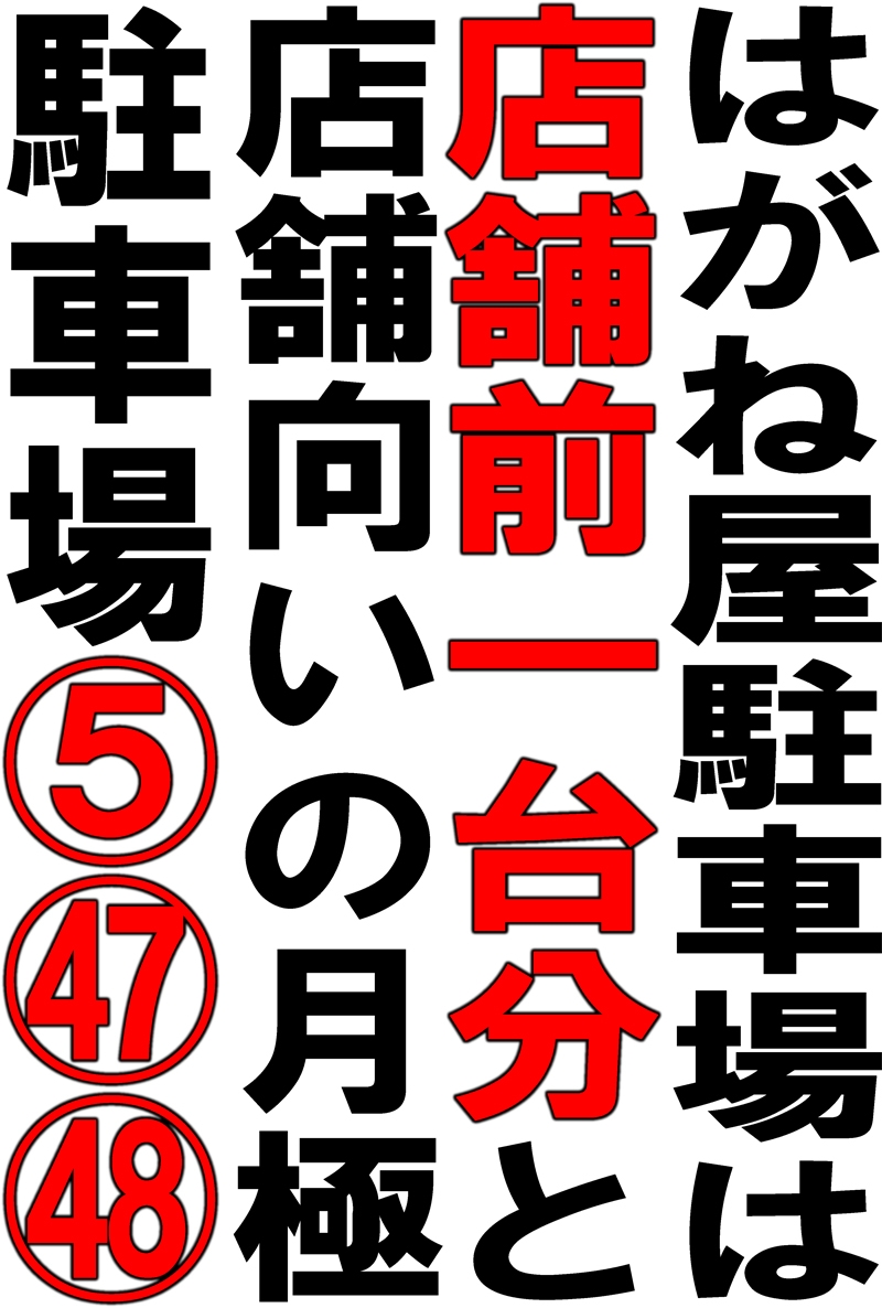 駐車場は店舗敷地内に1台分、店舗向かいの月極駐車場「5」「47」「48」のみです。